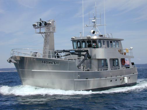 Abyssinia was designed for kayak adventure charters in SE Alaska. Heavily built, the all-aluminum vessel features a forward engine room, machinery space, and workshop, that enables large open areas in the after portions of the hull to facilitate accommodations and storage spaces.